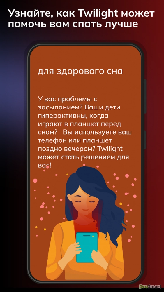 Приложение Twilight отфильтровывает голубой свет, способствуя хорошему сну. Вам трудно уснуть? Быть может, ваши дети слишком гиперактивны, когда играют в планшет перед сном? Или вы сами пользуетесь планшетом или смартфоном поздно вечером? Чувствительны ли вы к свету во время мигрени? Тогда Twilight – отличное решение для вас!