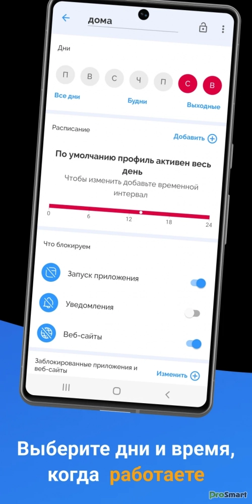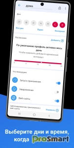 ✔ Вы можете выбрать время использования приложения каждый день, когда активен конкретный профиль. Например, только 20 минут Facebook в рабочее время или в школе.
