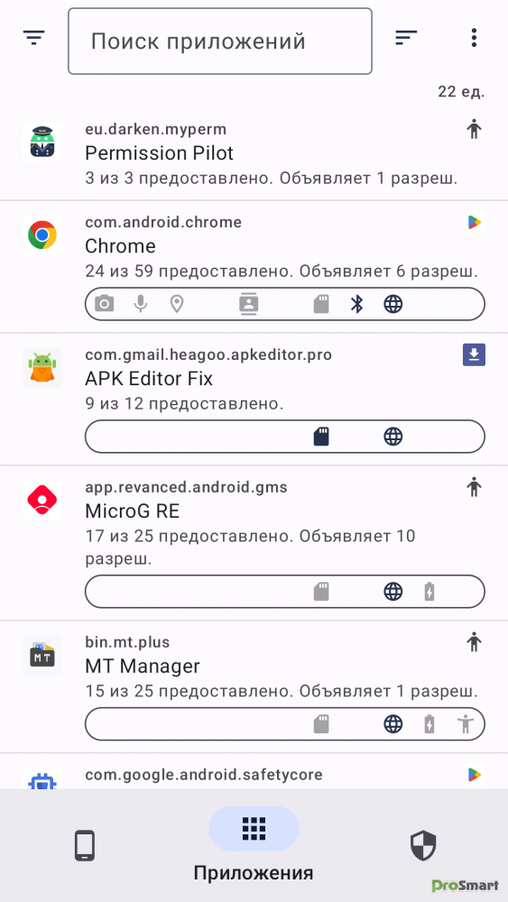 Приложения и разрешения можно искать по текстовому запросу, а также сортировать и фильтровать по различным критериям.