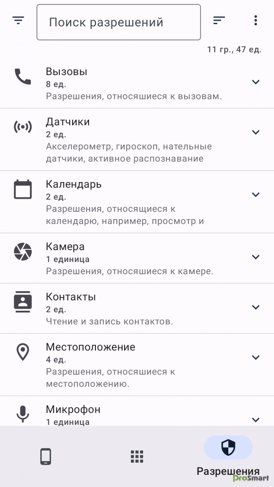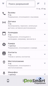 Для удобства навигации разрешения сгруппированы, например: «Контакты», «Микрофон», «Камера» и т. д.