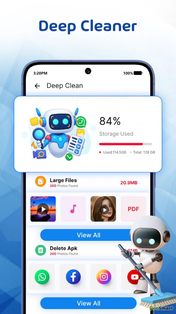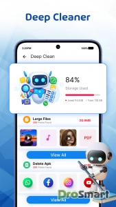 Ai cleaner помогает вам идентифицировать и удалять большие файлы, которые занимают ценное место на вашем устройстве. Большие файлы занимают слишком много места на устройстве. Phone cleaner обнаруживает и выводит список больших файлов, пользователи могут затем просмотреть Storage Cleaner и очистить большие файлы, чтобы очистить память телефона.