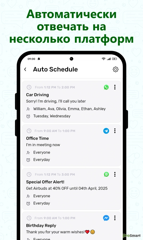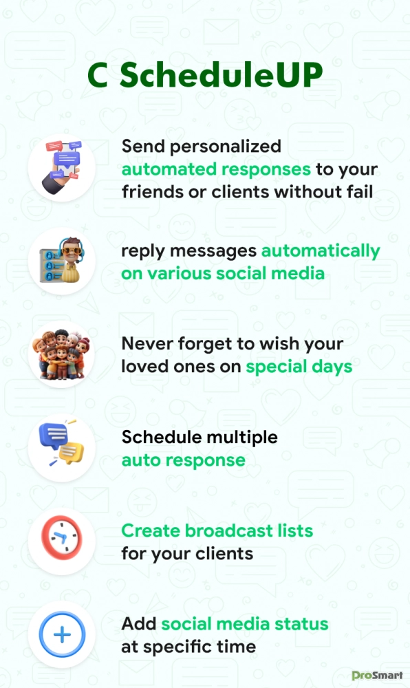 Повысьте производительность своего бизнеса с ScheduleUP! Наше комплексное приложение WhatsApp Scheduler и Autoresponder упрощает планирование сообщений в WhatsApp, WhatsApp Business, Telegram, SMS и FB Messenger. Планируете ли вы рекламные сообщения, автоматизируете взаимодействие с клиентами или обеспечиваете своевременные ответы, ScheduleUP позволяет вашему бизнесу эффективно взаимодействовать и максимизировать производительность.
