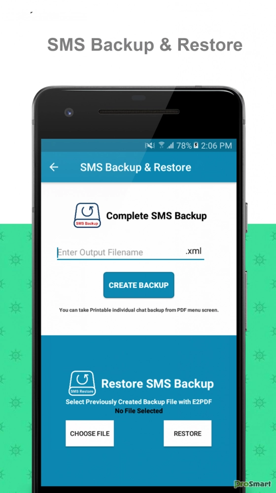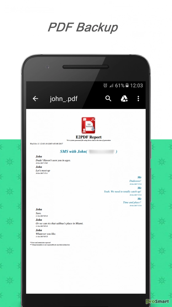 E2PDF - это очень простое, но очень продуктивное приложение, которое позволяет вам делать резервные копии смс-разговоров ваших любимых, а затем никогда не терять их снова. Вы можете восстановить их или сделать резервную копию PDF. Все, что вам нужно сделать, это выбрать беседу, и, прежде чем создавать резервную копию в PDF, на экране появится вся беседа, вы введете имя выходного файла и одним нажатием создадите резервную копию. Созданный файл резервной копии может быть сохранен на локальном диске или в электронной почте и может быть мгновенно предоставлен для совместного использования / сохранен в облачном хранилище.