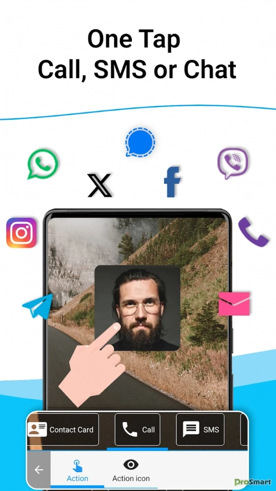 - Настройка действий по клику для каждого контакта (звонок, СМС, эл. почта, мессенджеры, социальные сети);