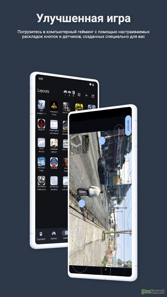 * Улучшенные игры: наслаждайтесь компьютерными играми с настраиваемыми кнопками и встроенными датчиками вашего телефона. Настройте управление под себя и получите незабываемый игровой опыт.