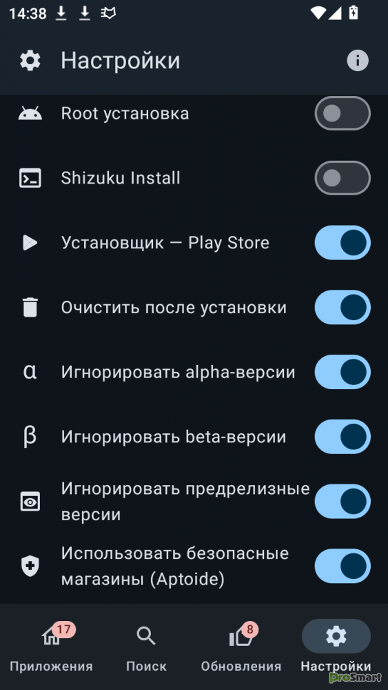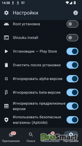 • Три метода установки: стандартный, root (тихая установка), Shizuku (тихая установка без root)